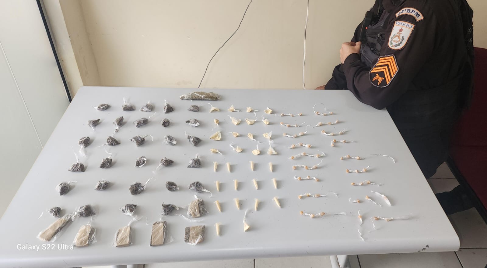Chegando, eles avistaram dois suspeitos que fugiram ao verem a viatura da PM. Porém, eles deixaram pra trás uma sacola com drogas. Dentro dela, havia 54 pedras de crack, 36 trouxinhas de maconha e 30 pinos de cocaína. A droga foi levada para a delegacia de Volta Redonda (93º DP).