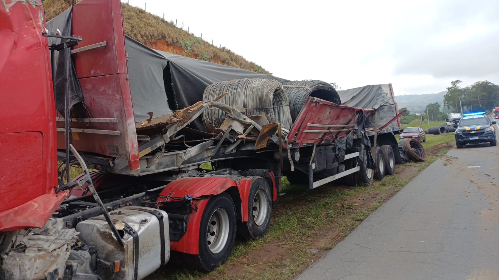O responsável pela seguradora da carga também esteve no local para acompanhar o trabalho de retirada das bobinas de vergalhão de aço, transportadas por uma das carretas envolvidas. O preenchimento do Comunicado de Sinistro de Trânsito (CST) foi orientado pelas autoridades competentes.