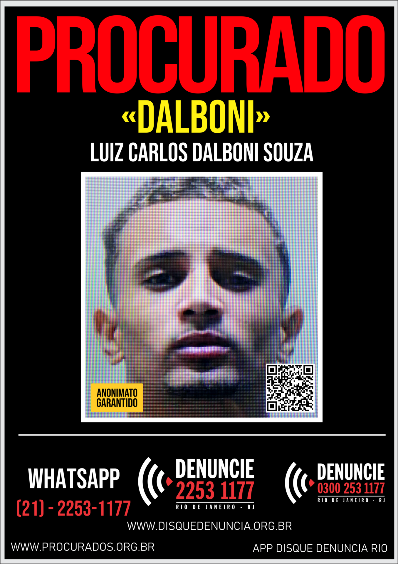 O Disque Denúncia divulga, nesta quarta-feira (21), um cartaz de procurado, para ajudar em inquéritos instaurados pela 90ª DP (Barra Mansa), a fim de obter informações que levem à localização e prisão do criminoso, foragido da Justiça, Luiz Carlos Dalboni Souza, mais conhecido pelo apelido de “Dalboni”, de 23 anos.