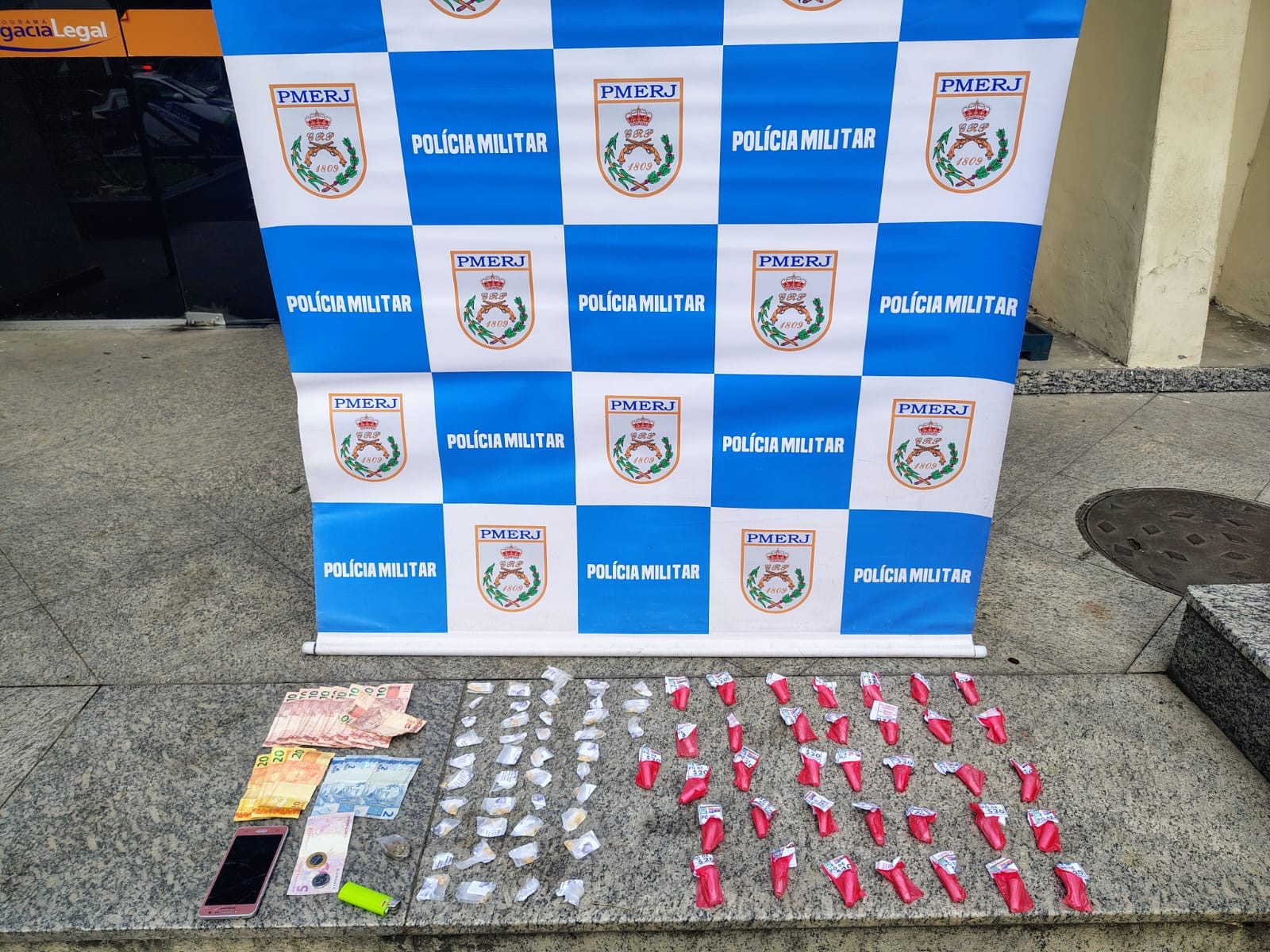 Durante a abordagem, os policiais encontraram com o adolescente 36 pinos de cocaína (57g), 43 pedras de crack (7,9g), uma trouxinha de maconha (1,7g), R$172,50 em dinheiro e um telefone celular.