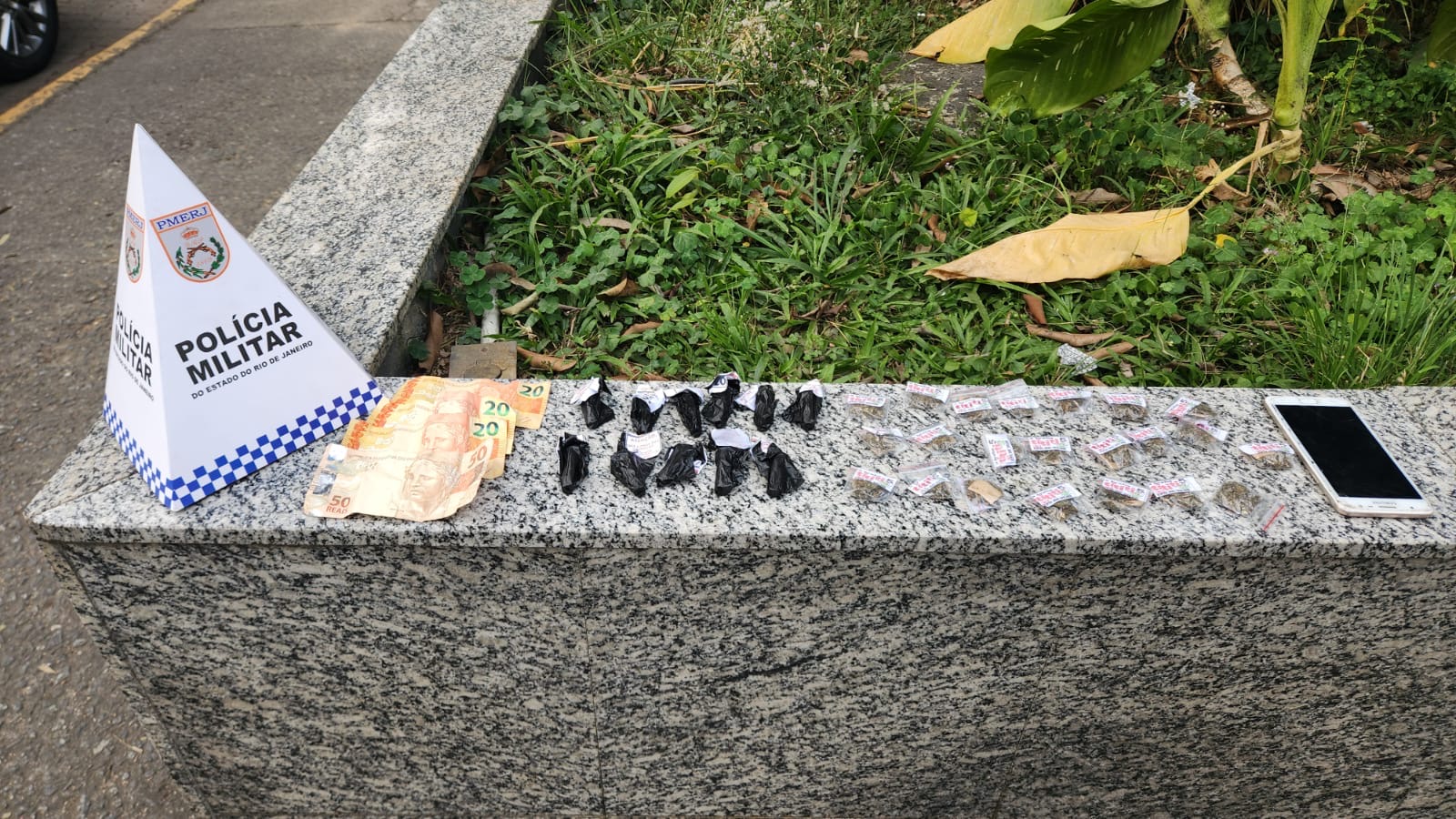 Durante buscas no local, os policiais encontraram a sacola com 22 trouxinhas de maconha (22g), 11 pinos de cocaína (11g), R$ 110 em dinheiro e um telefone celular.
