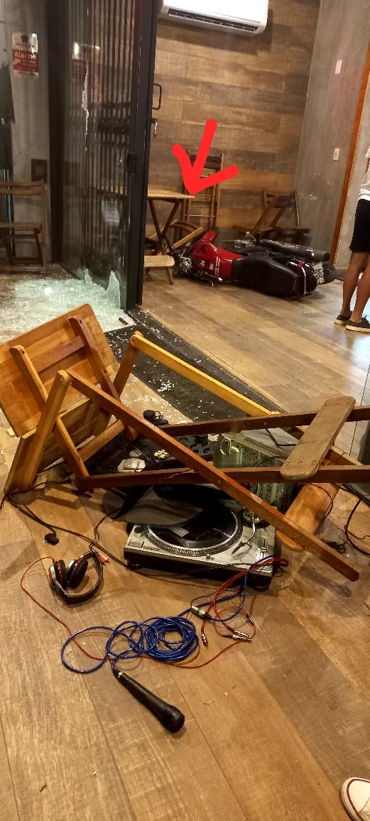 Segundo a Guarda Municipal, o motociclista tentou empinar a moto, perdeu o equilíbrio e foi parar dentro do estabelecimento. Apesar do susto, nenhum cliente foi atingido ou ficou ferido.