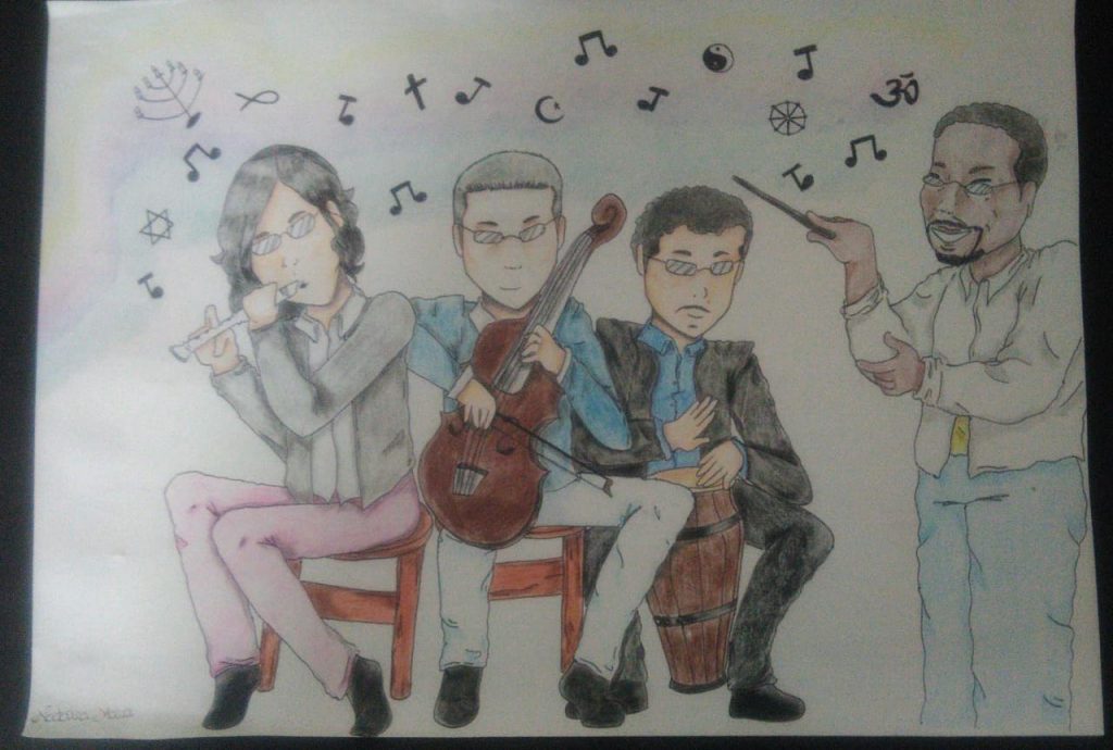 “O judeu toca violoncelo porque é o instrumento que se iguala a voz humana, nosso instrumento natural para louvar. O umbandista está tocando um tambor, que representa a conexão do homem com a natureza e as batidas do coração. O filósofo está tocando uma flauta, que é um instrumento muito antigo usado desde fins religiosos até vários tipos de música (que como a filosofia e neutra) ela permeia bem entre dois mundos”, disse a menina de 14 anos, que sonha estudar no IME (Instituto Militar de Engenharia).