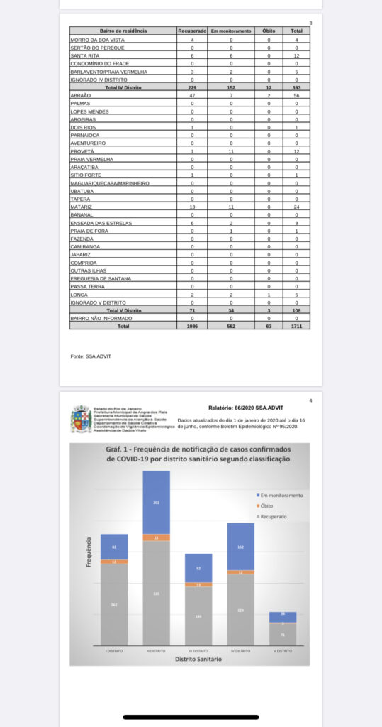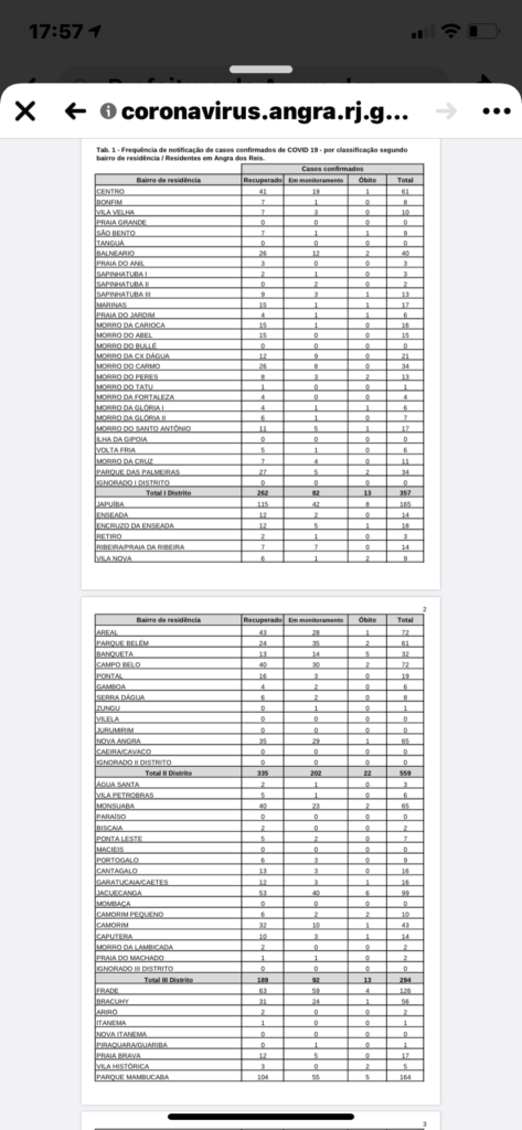 Segundo relatório da Secretaria de Saúde, atualizado em 23 de junho, os bairros com maior índice de confirmação do novo coronavírus são: Japuíba (193), Parque Mambucaba (186), Frade (146), Jacuecanga (114) e Areal (87). Na Ilha Grande inteira há 123 casos da doença.