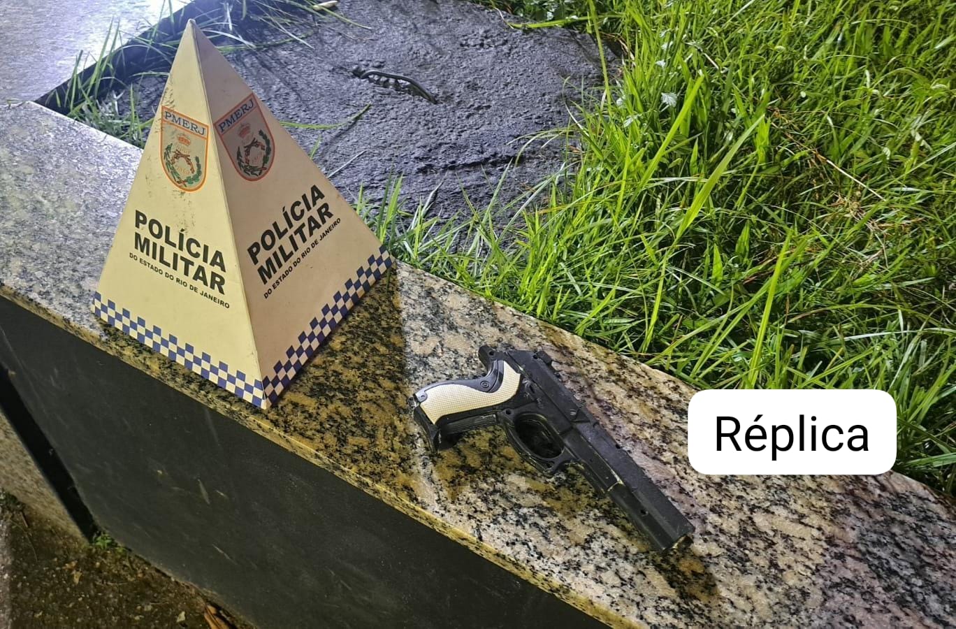 Com base em relatos de testemunhas, os policiais realizaram uma varredura nas imediações e localizaram, em uma área de mata, um simulacro de pistola que teria sido utilizado na ação criminosa.