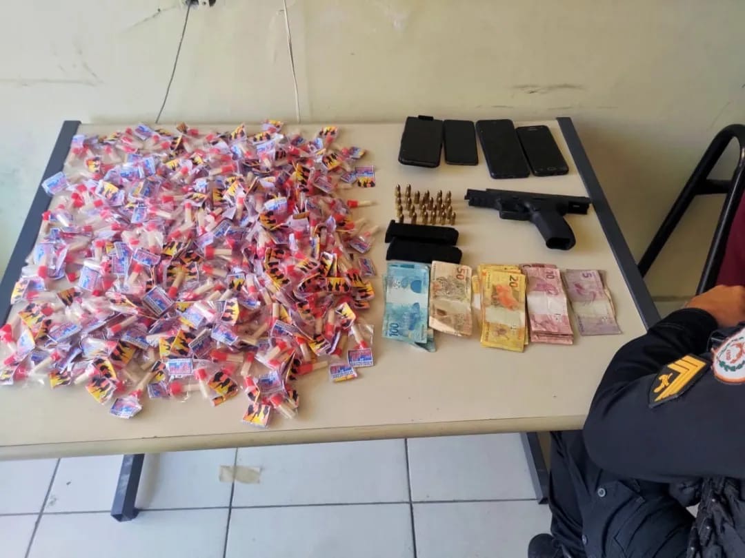 Chegando ao endereço, o autor das ameaças não foi encontrado e os militares foram até a casa dele. Não estando lá, os agentes tiveram a autorização para entrar na residência. Num quarto, foram encontrados 452 pinos de cocaína, R$ 1.240, uma pistola 9 mm com 26 munições.