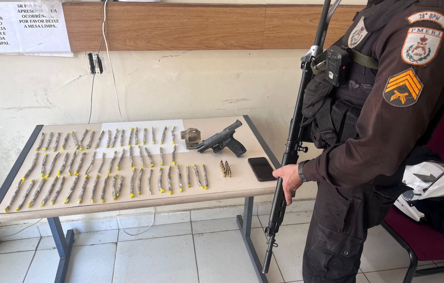 Com ele, havia uma pistola com 11 munições intactas e uma deflagrada. E ainda apreenderam ainda 52 tabletes de maconha, um coldre para a arma e o celular do detido. Os materiais, o suspeito e as drogas foram levados para a delegacia de Volta Redonda (93º DP).