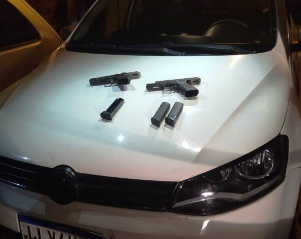 Os presos estavam num Gol branco. No carro os policiais encontraram duas pistolas calibre 9mm, ambas equipadas com o chamado “kit rajada”, que aumenta o poder de fogo da arma. Também foram apreendidos os carregadores das duas pistolas e 32 munições do mesmo calibre.