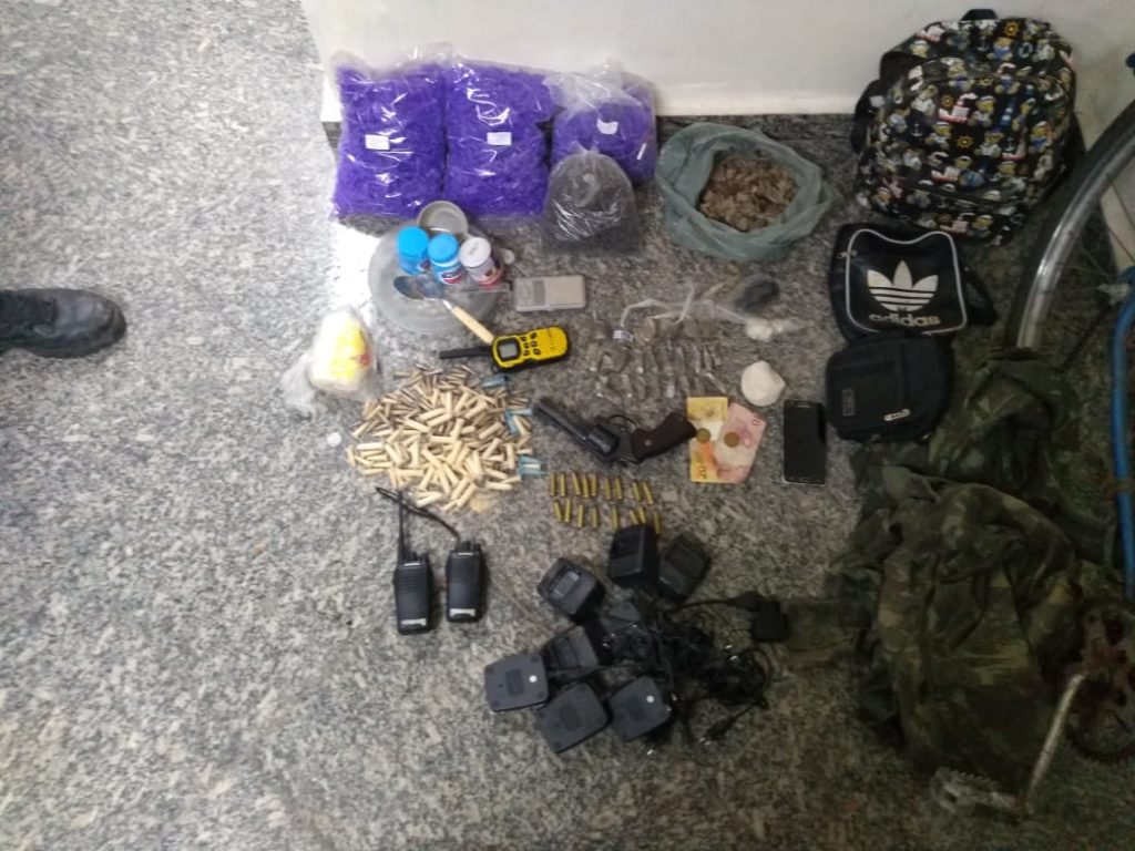 Foram apreendidos com a dupla: um revólver calibre 38; munições intactas; 25 tablete de maconha; um tablete com 200 g de pasta base de cocaína; 160 pinos de cocaína; 241 pedras de crack, além de três mil pinos vazio, três rádios transmissor e R$ 240,00 em espécie.