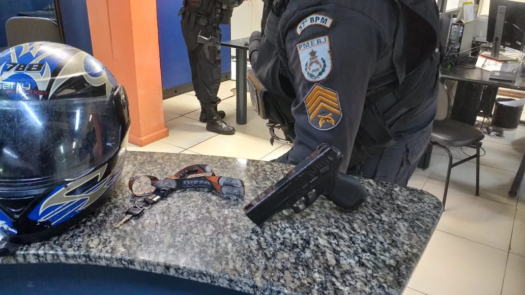 Um tiro de advertência foi disparado, o que levou o condutor da moto a parar. Com um deles, foi apreendido uma réplica de pistola.