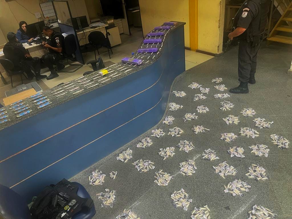 E ainda: 115 tiras de maconha, 884 pinos de cocaína, além de dois celulares e R$ 37. Algemados, os dois suspeitos e materiais foram levados para a delegacia de Valença (91º DP), onde o caso foi registrado.