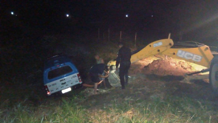 Os policiais não se feriram, mas foi preciso a utilização de uma retroescavadeira para retirar o carro da PM do buraco.