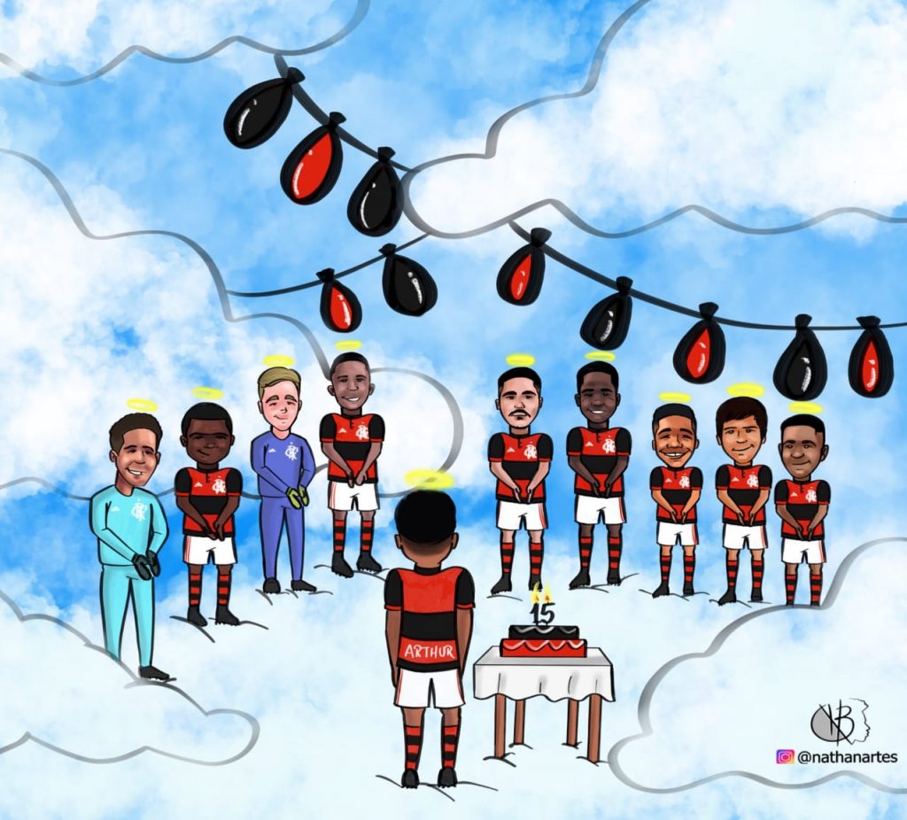 Já o ilustrador Nathan Barros, de 27 anos, desenhou as dez vítimas do incêndio no céu comemorando o aniversário de Arthur.
