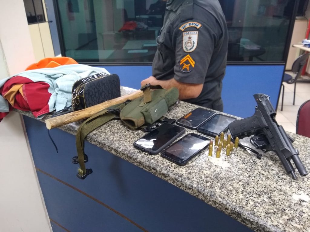 Com eles, além do produto do assalto, havia uma pistola e um bastão de madeira. Os detidos tem: 18, 19 e 35 anos.