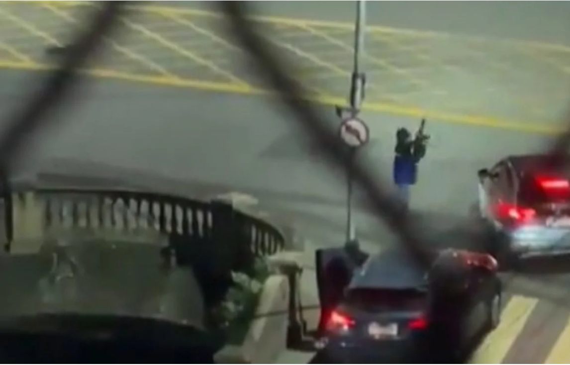 Nas imagens, é possível ver um carro bloqueando a passagem de outro veículo, de onde sai um homem segurando uma arma que aparenta ser um fuzil. Esse criminoso chega a apontar para um táxi que cruza a Rua Professor Gabizo.