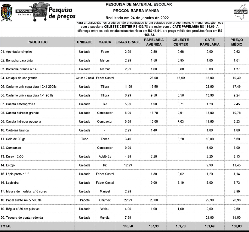 A Secretaria de Governo de Barra Mansa, através do Procon (Programa de Proteção e Defesa do Consumidor), realizou nesta segunda-feira, dia 24, a pesquisa de material escolar em 2022.
