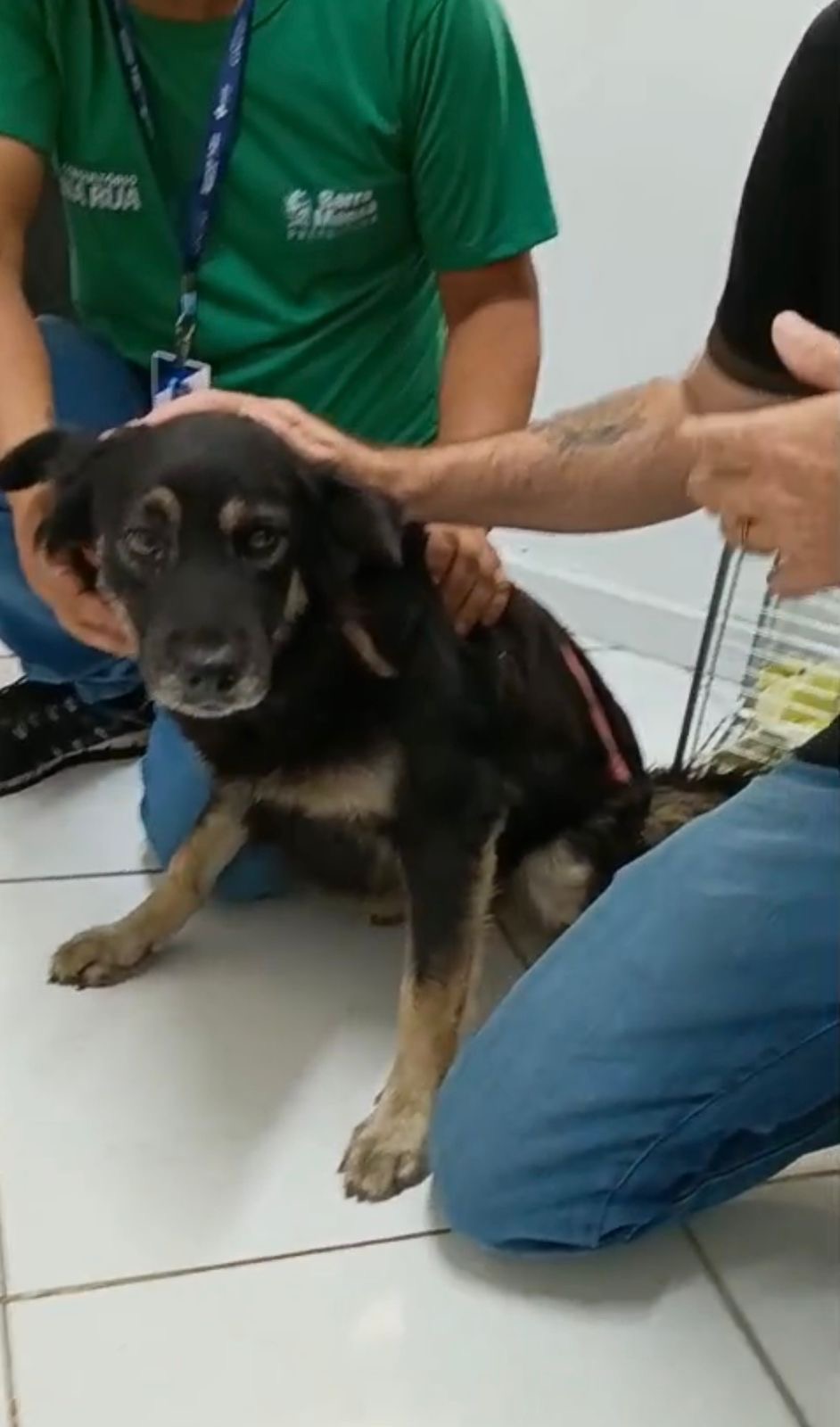 A cadela é tutelada por um morador em situação de rua, acompanhado pelo programa Consultório na Rua. Após contato com a secretaria, a equipe se deslocou até o local para prestar socorro ao animal.