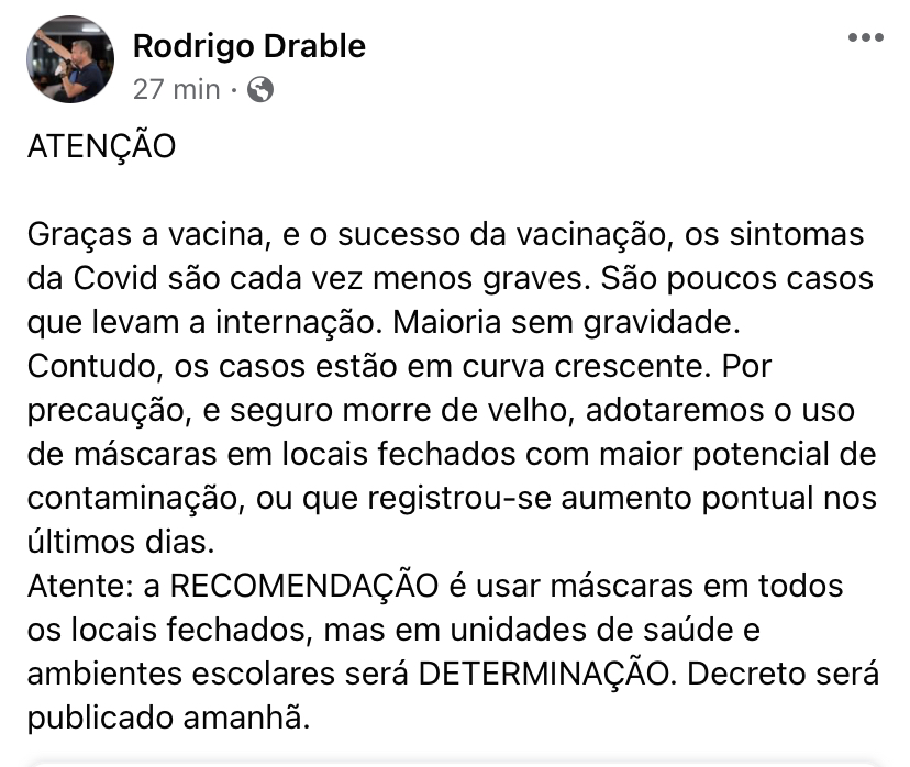Ele recomendou que o uso de máscaras em locais fechados, mas não será obrigatório. Confira o post do prefeito de Barra Mansa.