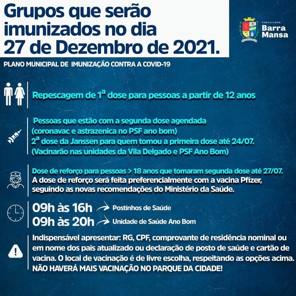 Após o feriado de Natal, a vacinação em Barra Mansa contra o COVID-19 volta na cidade, conforme foi publicado pela prefeitura na manhã desta segunda-feira (27). Confira abaixo o cronograma: