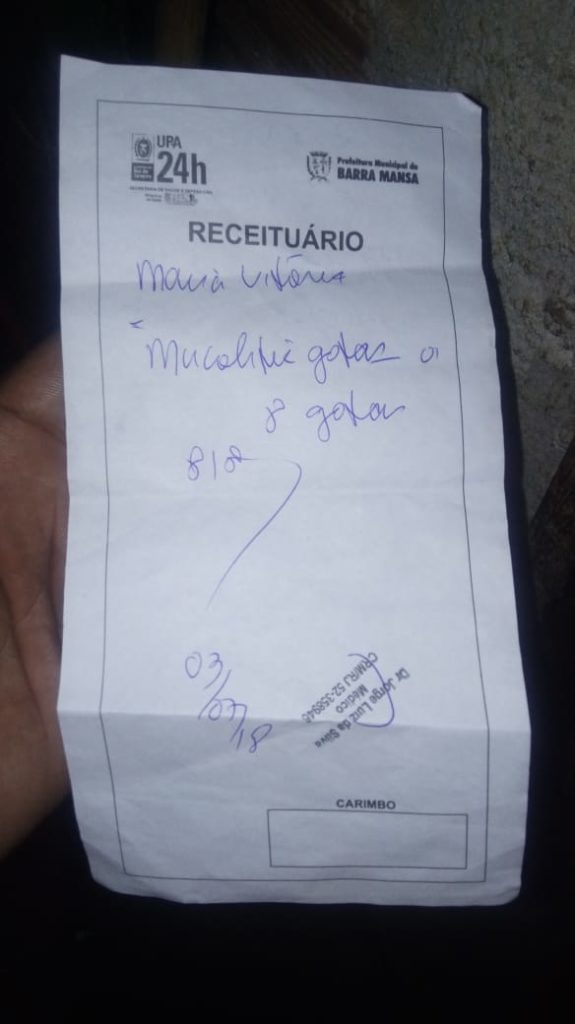 Um remédio foi receitado pela pediatria, entretanto, a bebê continuou passando mal, retornado à UPA nesta terça-feira, por volta das 23h, sendo atendida pelo mesmo médico, que a receitou outro medicamento e simplesmente mandou a família voltar para casa. Horas depois, Maria Vitória faleceu em casa – na Estrada do Sertão N°620, Atlaufo de Paiva, Barra Mansa