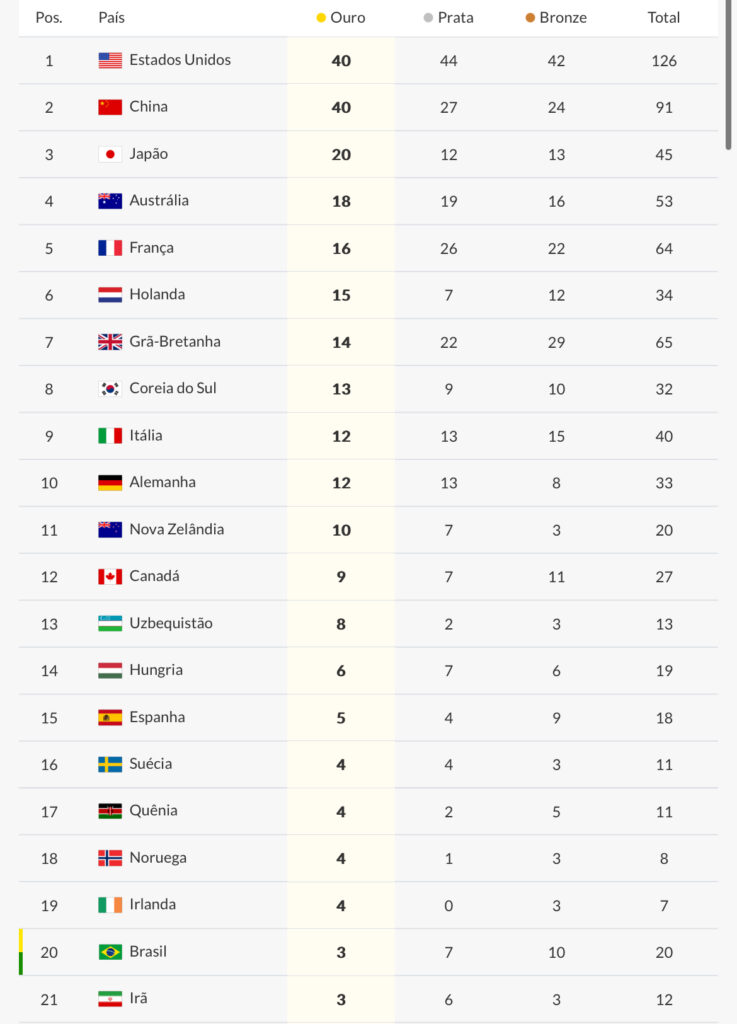 A China ficou na segunda colocação com 40 ouros, com 27 pratas e 24 bronzes, somando 91 medalhas. Fechou o pódio do quadro de medalhas da Olimpíada de Paris o Japão, com 45 medalhas, sendo 20 de ouro, 12 de prata e 13 de bronze.