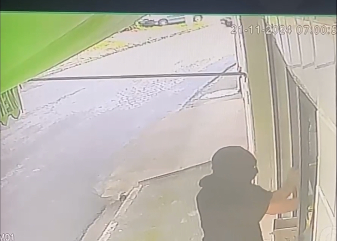 Logo seguida, já com o rosto coberto por um capuz e com uma arma em mãos, ele aponta a arma para o interior do estabelecimento e entra. Depois, deixa o local levando a gaveta do caixa contendo R$ 300 em espécie.