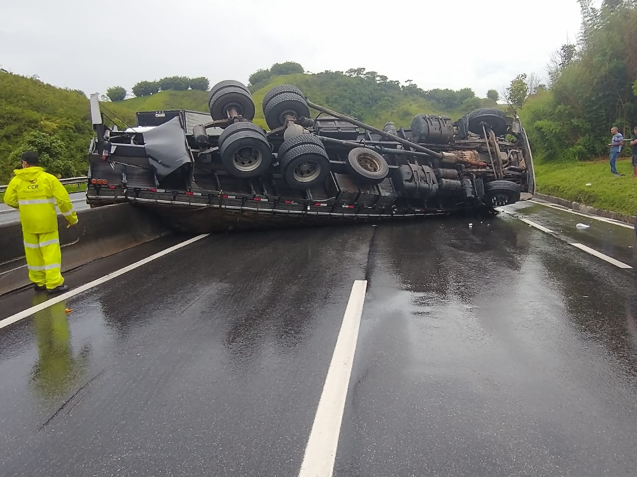 Segundo a Polícia Rodoviária Federal, o caminhoneiro perdeu o controle da direção e tombou com o veículo sobre a mureta que divide os dois sentidos da estrada. Chovia no momento do acidente.