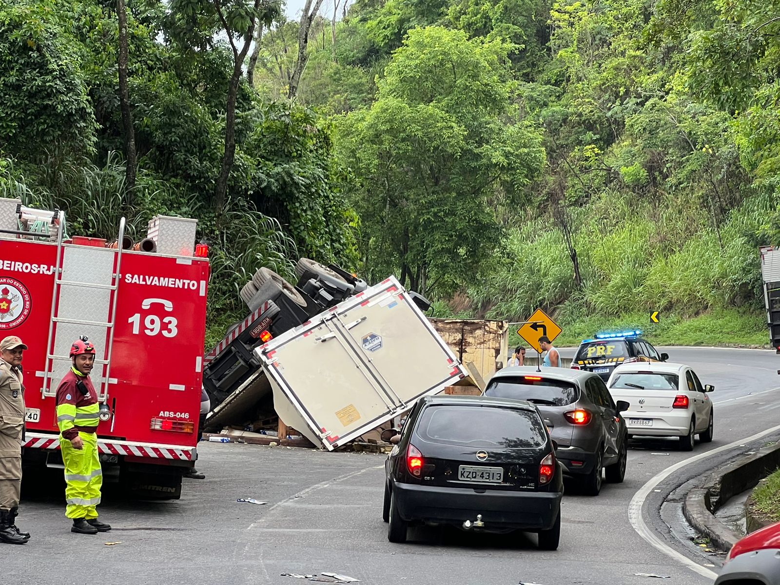 Um caminhão que transportava leite tombou na tarde desta segunda-feira (5) na pista de descida da Serra das Araras, em Piraí (RJ). O acidente aconteceu na altura do km 226 da Via Dutra.