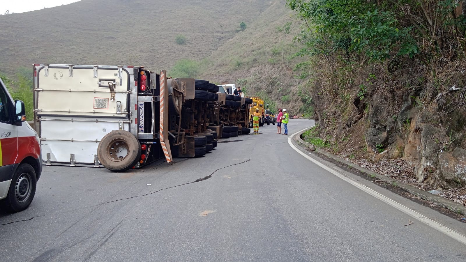 Um caminhão, que estava transportando frango, tombou na Via Dutra, em Piraí. O acidente aconteceu na tarde desta segunda-feira (28) na descida (sentido Rio) da Serra das Araras, na altura do km 232.