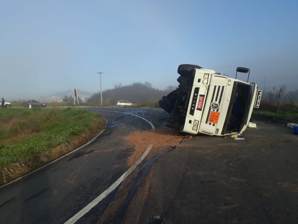 O trânsito na Rodovia do Contorno, em Volta Redonda, está em meia pista. O motivo foi o tombamento de um caminhão na entrada da via, na altura do Santo Agostinho.