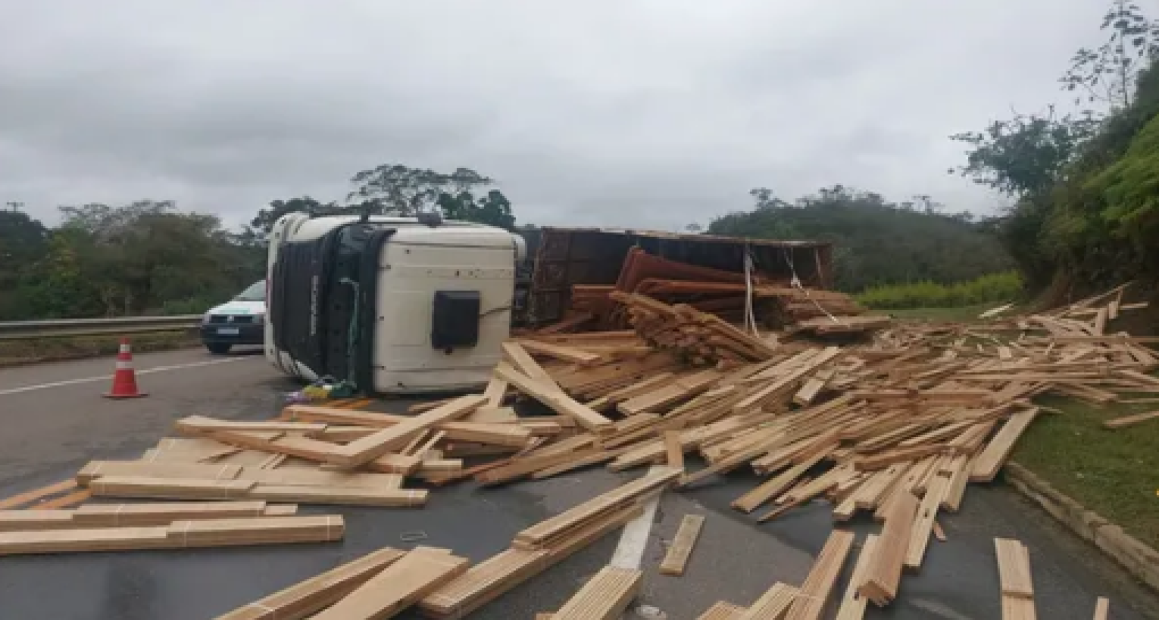 Ainda de acordo com a empresa, houve queda de carga de madeira na pista.