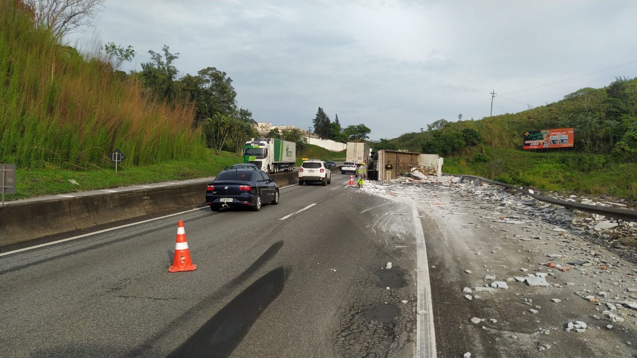Carreta tomba e motorista fica ferido na Via Dutra, em Barra Mansa