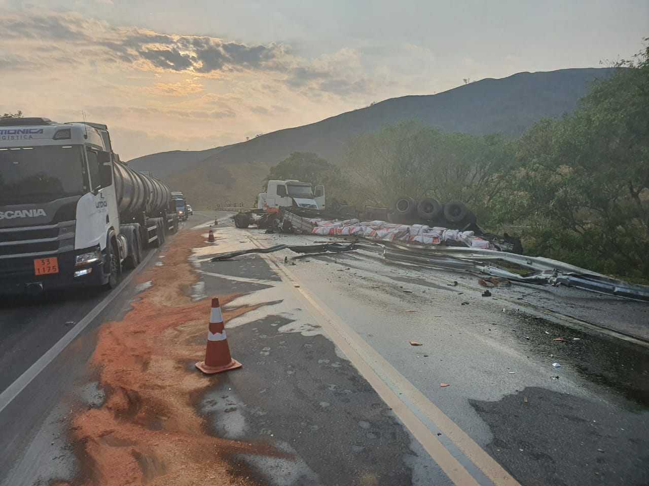 Uma carreta tombou na manha desta quarta-feira (14) na BR-393 após perder o controle numa curva próximo ao distrito Andrade Pinto, em Vassouras. As informações são da Polícia Rodoviária Federal. A carga estava carregando fertilizante.