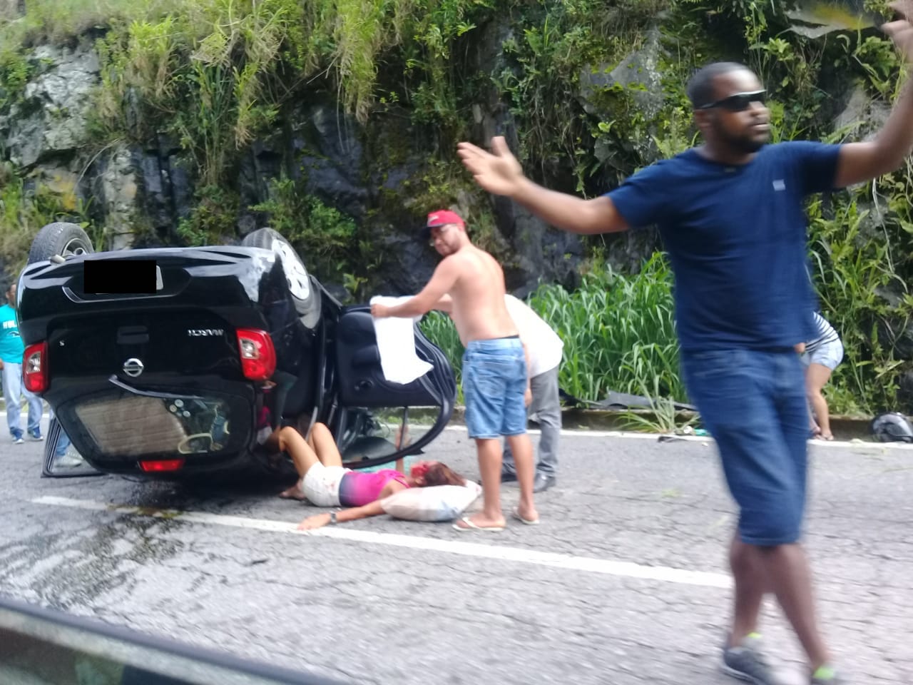 Um carro de passeio (Marcha preto) capotou no final da tarde deste sábado (5) na Rio-Santos (BR-101), em Angra dos Reis.