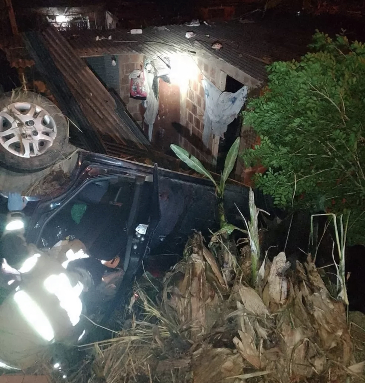 Carro sai da pista, cai sobre casa e deixa três pessoas feridas