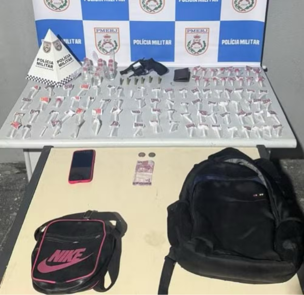 Segundo a Polícia Militar, com os suspeitos, foram apreendidos um revólver calibre 38 milímetros, seis munições calibre 38 milímetros, 89 cápsulas de cocaína, 10 frascos de loló, um celular, uma carteira com diversos cartões, uma mochila, uma bolsa e a quantia de R$ 7.