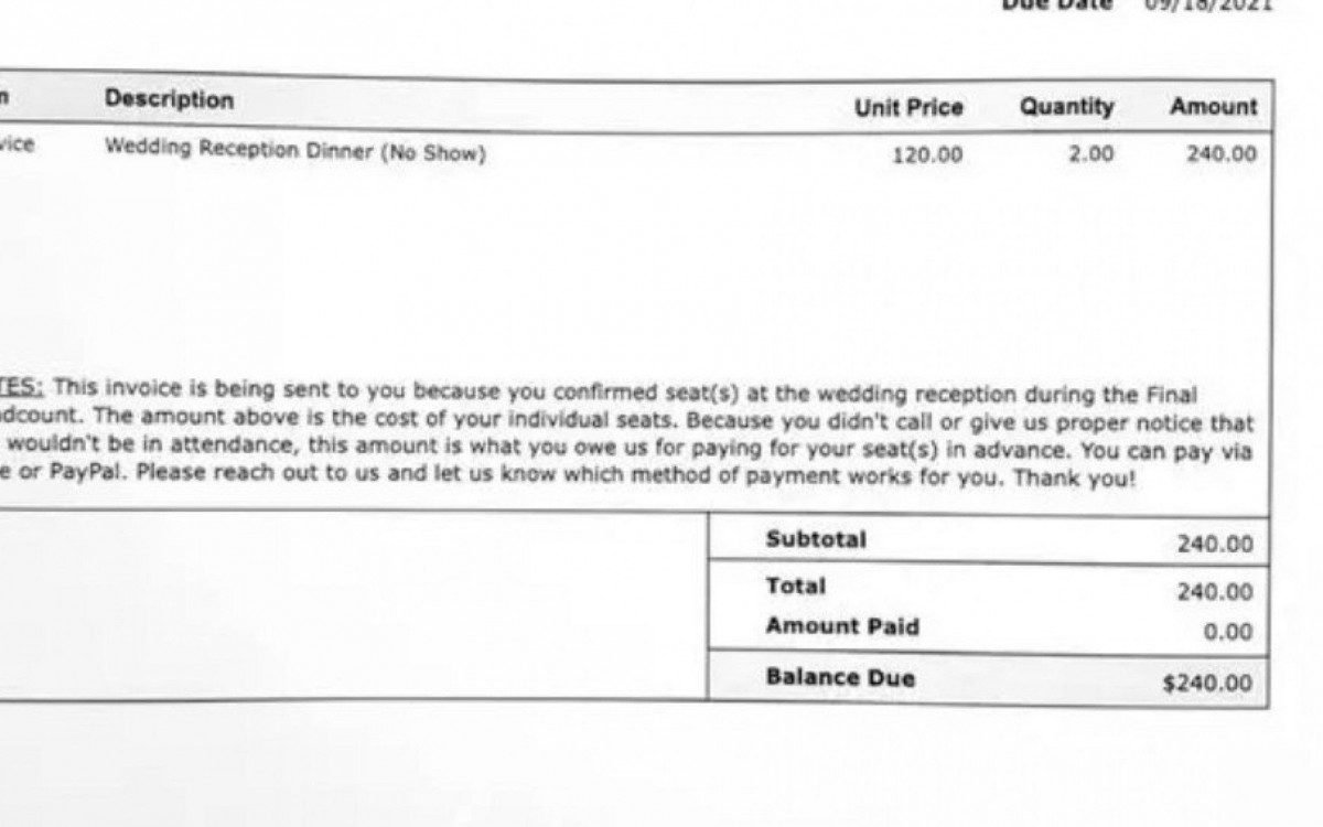 Na futura enviada aos convidados, a situação está explicada. “Esta fatura está sendo enviada a você porque você confirmou o(s) assento(s) na recepção do meu casamento na contagem final. Como você não ligou ou nos deu a devida notificação de que não compareceria, este valor é o que você nos deve pelo pagamento antecipado de seu(s) assento(s). Você pode pagar via Zelle ou PayPal. Entre em contato conosco e informe qual método de pagamento funciona para você. Obrigado!”, diz a fatura.
