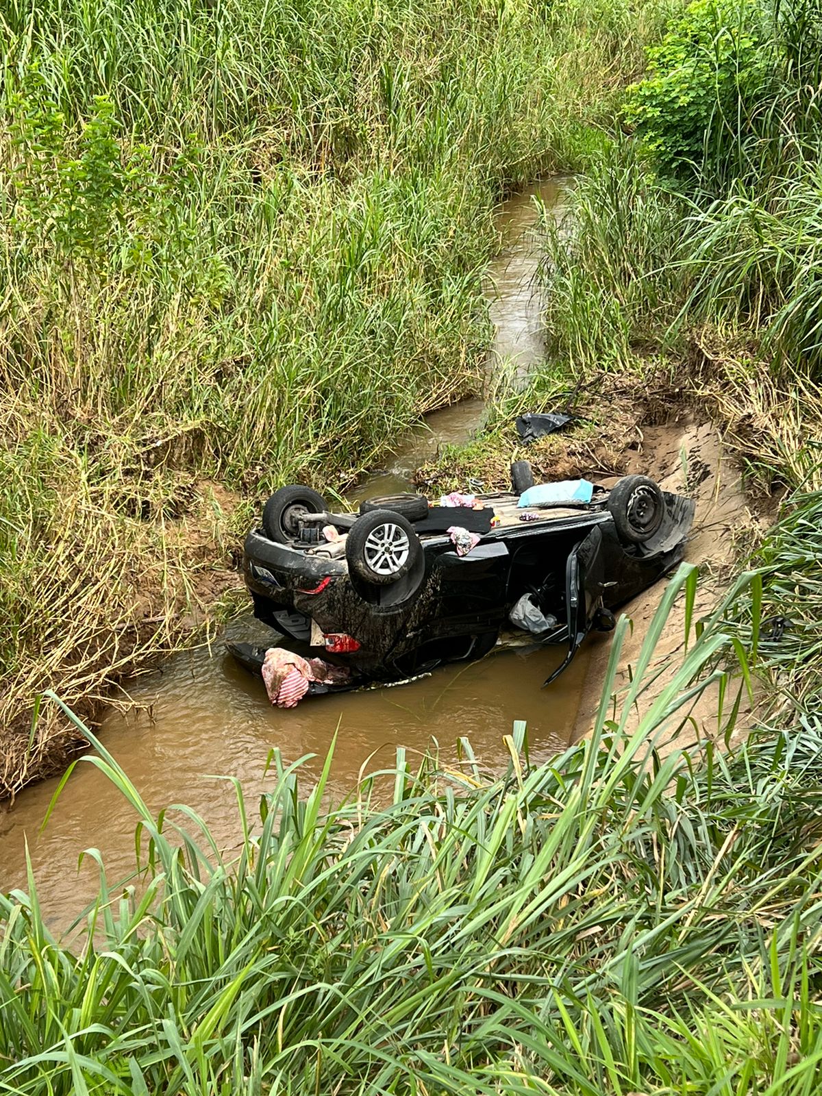 Um carro saiu da pista e caiu em um córrego na manhã deste domingo (19) na Via Dutra, em Piraí (RJ). O acidente aconteceu na pista sentido São Paulo, na altura do km 241.