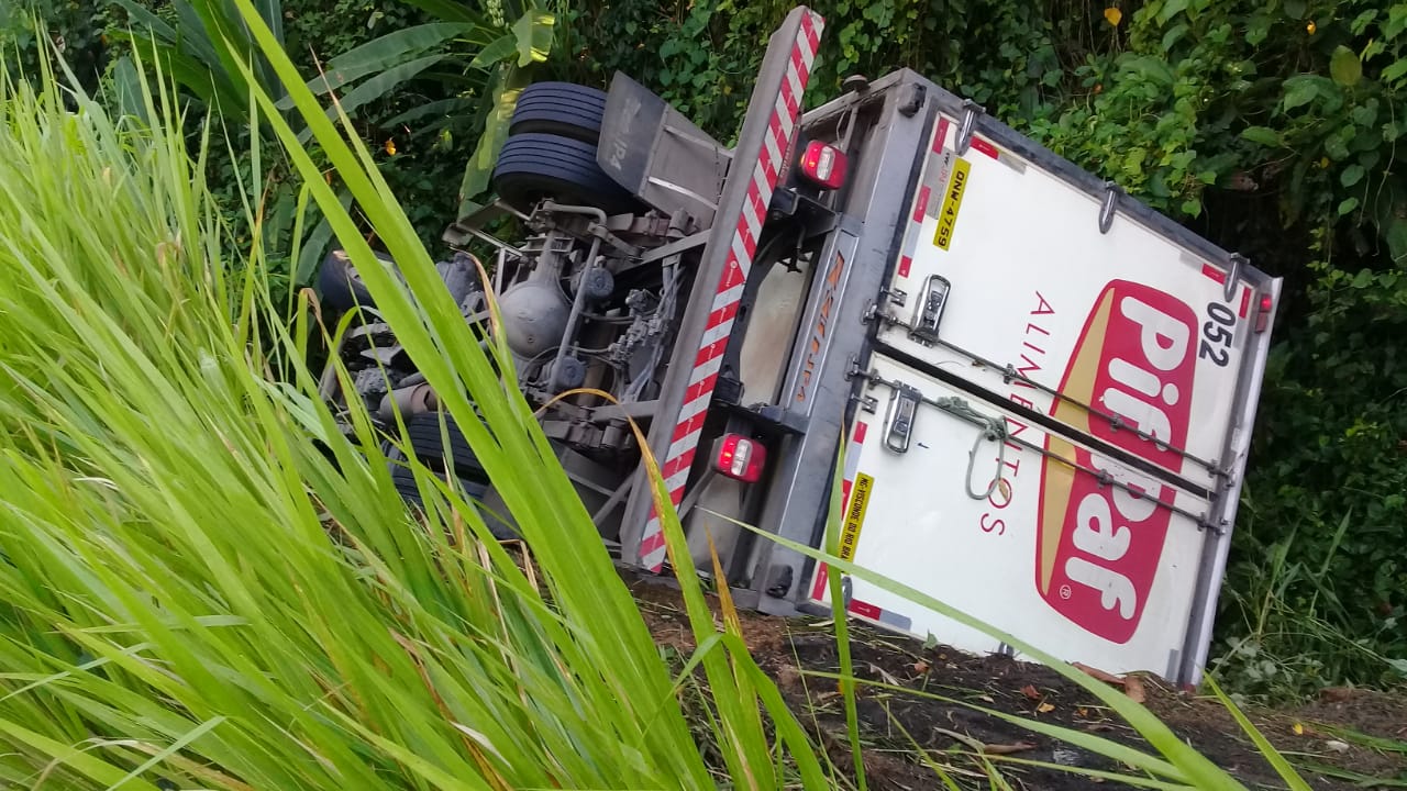 Duas pessoas (motorista e auxiliar) ficaram feridas após o tombamento de um caminhão na manhã desta