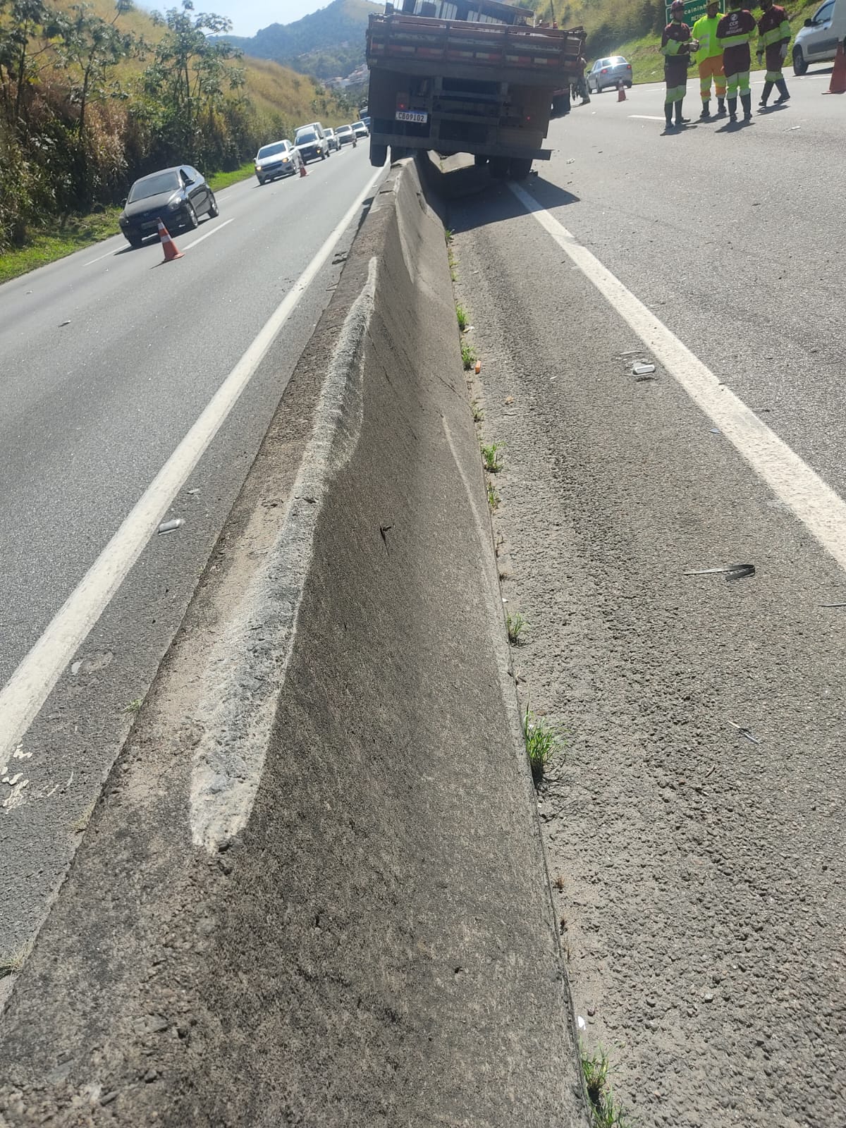 Duas pessoas ficaram feridas após um caminhão subir na mureta na Via Dutra, em Barra Mansa.