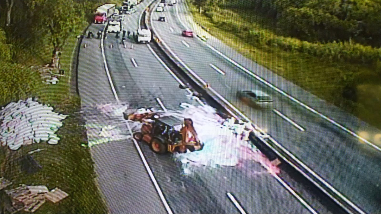 Um caminhão, que transportava carga de reciclagem, tombou na madrugada desta quarta-feira (5) na Via Dutra,