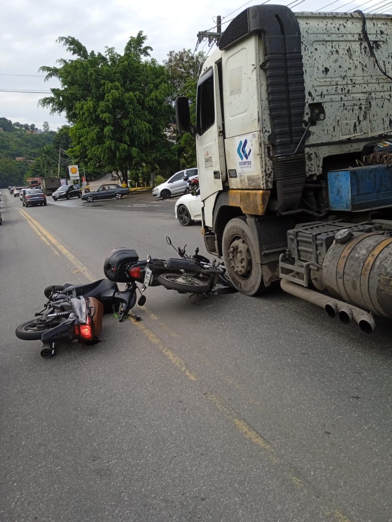 Um acidente, entre duas motos e uma carreta, foi registrado na manhã desta quarta-feira (15) em