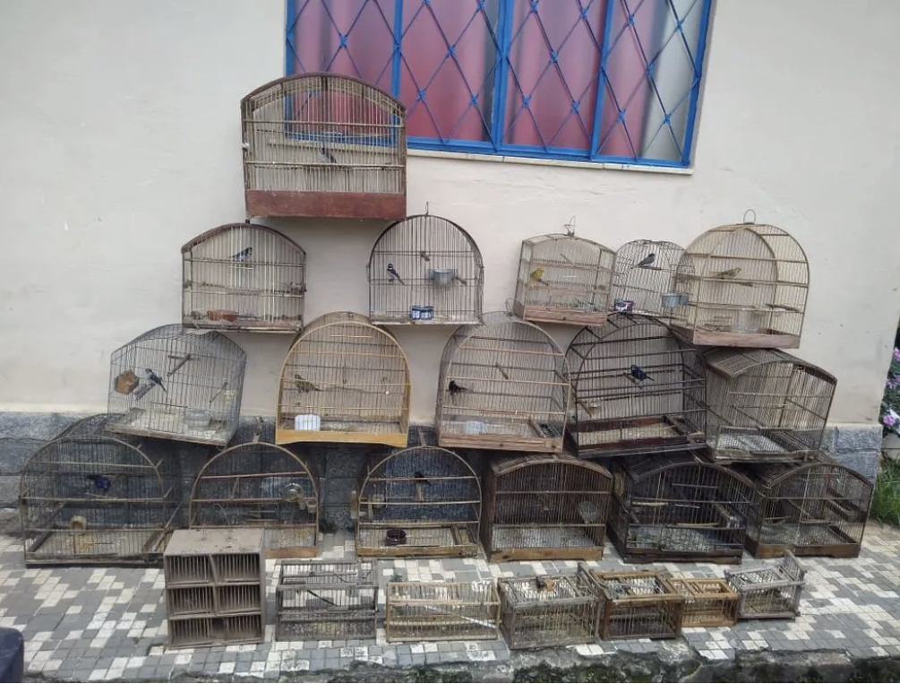 A Polícia Militar resgatou, na manhã deste sábado (5), 19 pássaros silvestres mantidos em um cativeiro