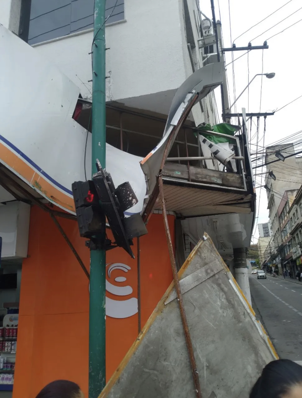 Um ônibus de viagem atingiu uma marquise e derrubou uma placa da fachada de uma drogaria
