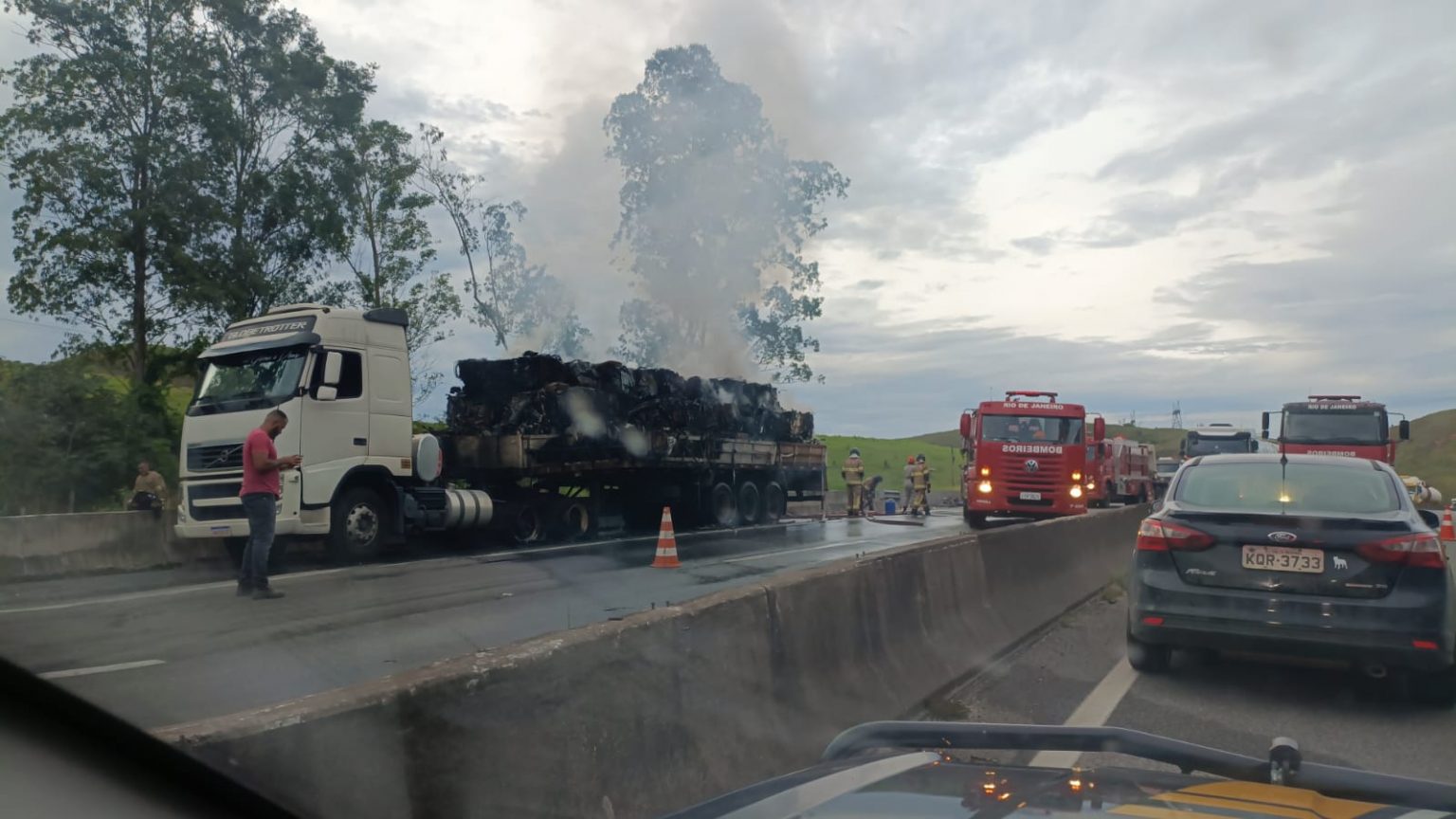 Uma carreta carregada de sucata pegou fogo na Via Dutra, em Barra Mansa (RJ), na tarde