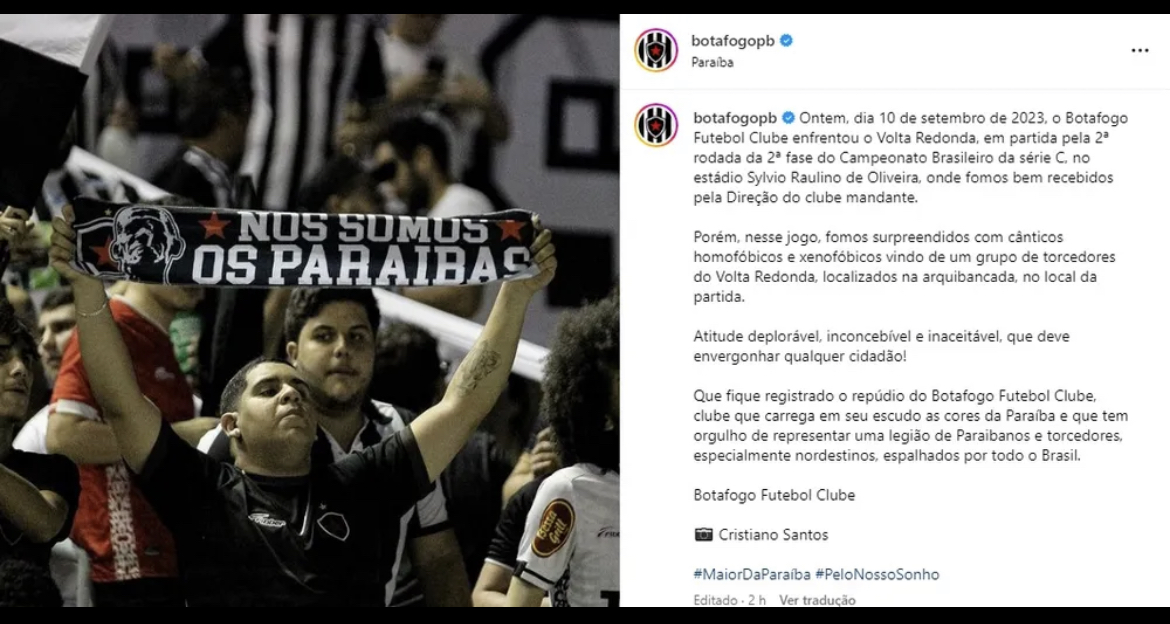 O Volta Redonda se manifestou nesta terça-feira e demonstrou repúdio ao canto homofóbico e xenofóbico cometido