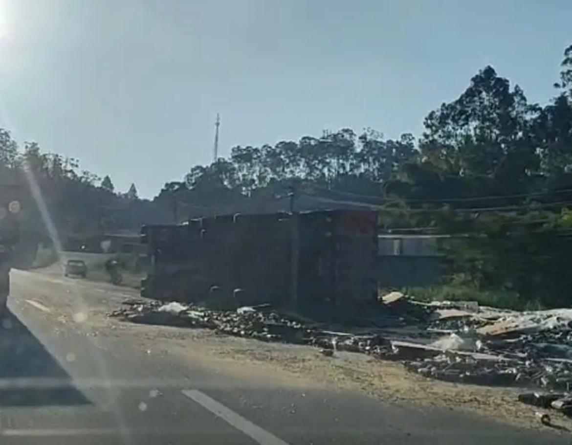 Uma carreta que transportava garrafas de vidro tombou na tarde desta quinta-feira (7) na Via Dutra,