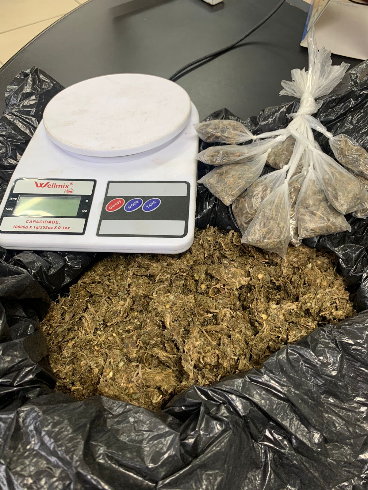 Uma sacola plástica contendo erva seca solta, 13 sacolés com erva seca e uma balança de