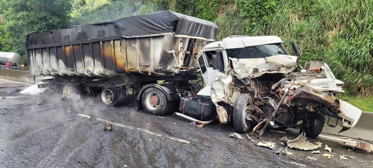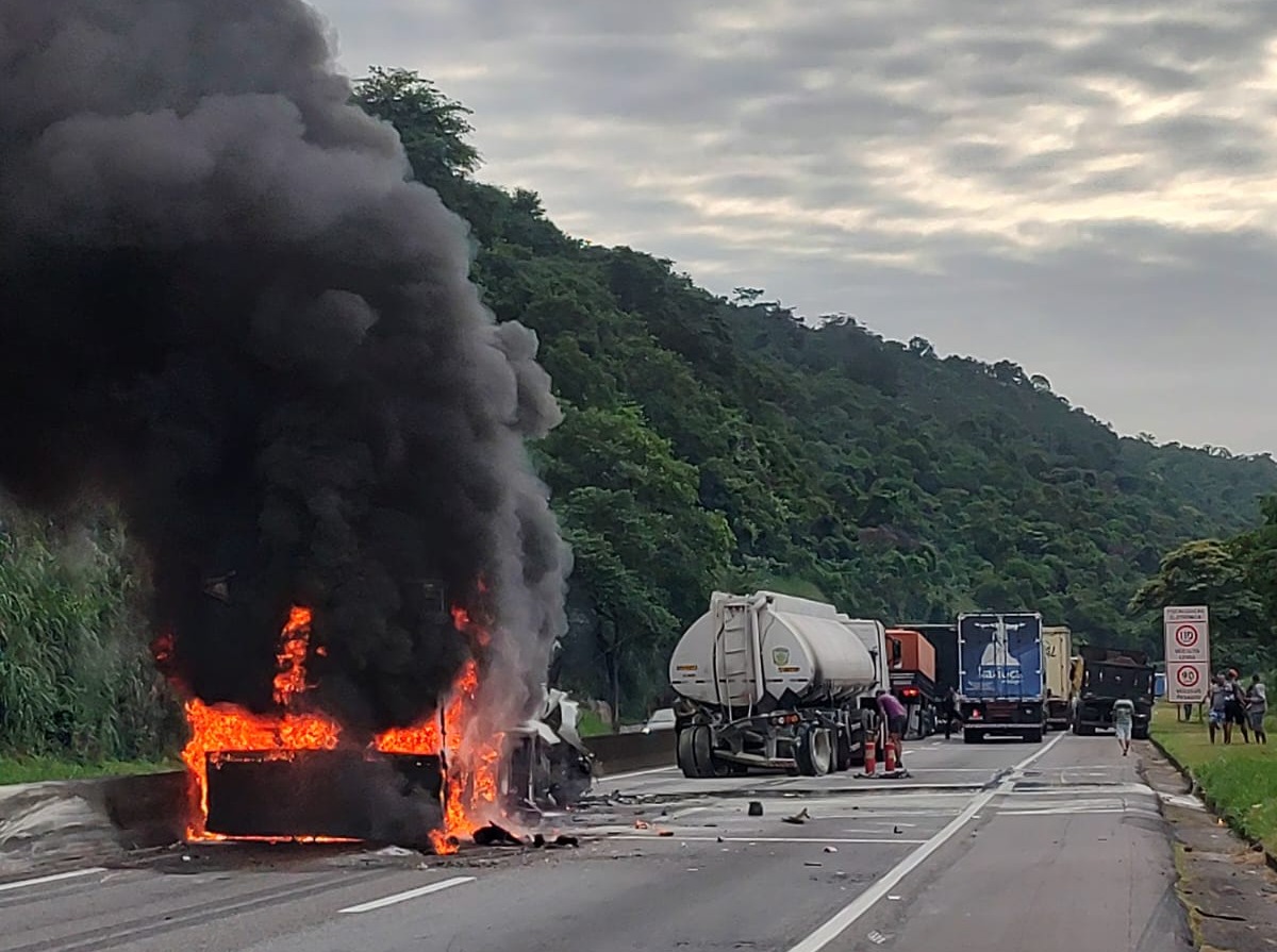 Um caminhão pegou fogo após bater numa carreta-tanque na manhã desta terça-feira (28) em Volta Redonda.