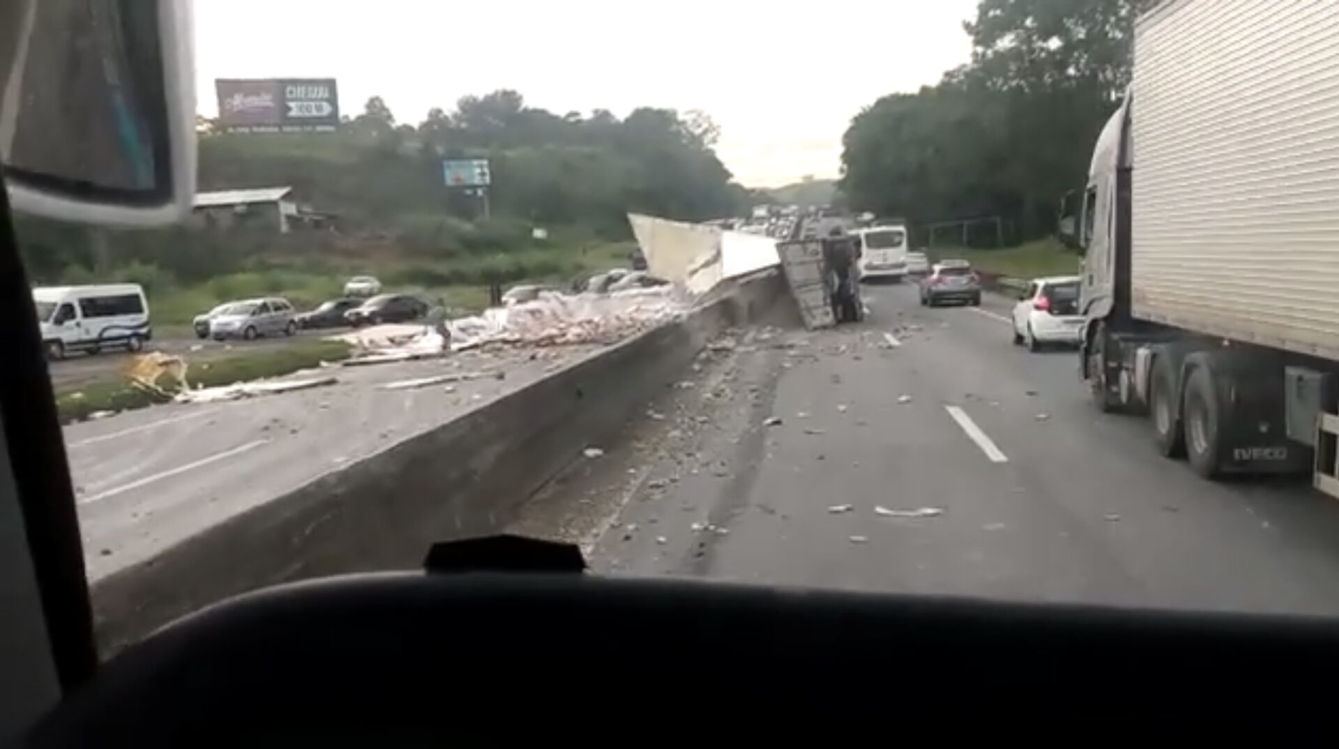 Uma carreta tombou no final da madrugada desta segunda-feira (6) na Via Dutra, em Piraí. O